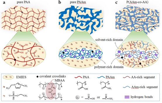 Ionogels are compelling materials for technological devices due to their excellent ionic conductivity, thermal and electrochemical stability, and non-volatility. However, most existing ionogels suffer from low strength and toughness. Here, we report a simple one-step method to achieve ultra-tough and stretchable ionogels by randomly copolymerizing two common monomers with distinct solubility of the corresponding polymers in an ionic liquid. Copolymerization of acrylamide and acrylic acid in 1-ethyl-3-methylimidazolium ethyl sulfate results in a macroscopically homogeneous covalent network with in situ phase separation: a polymer-rich phase with hydrogen bonds that dissipate energy and toughen the ionogel; and an elastic solvent-rich phase that enables for large strain. These ionogels have high fracture strength (12.6 MPa), fracture energy (~24 kJ m−2) and Young’s modulus (46.5 MPa), while being highly stretchable (~600% strain) and having self-healing and shape-memory properties. This concept can be applied to other monomers and ionic liquids, offering a promising way to tune ionogel microstructure and properties in situ during one-step polymerization.